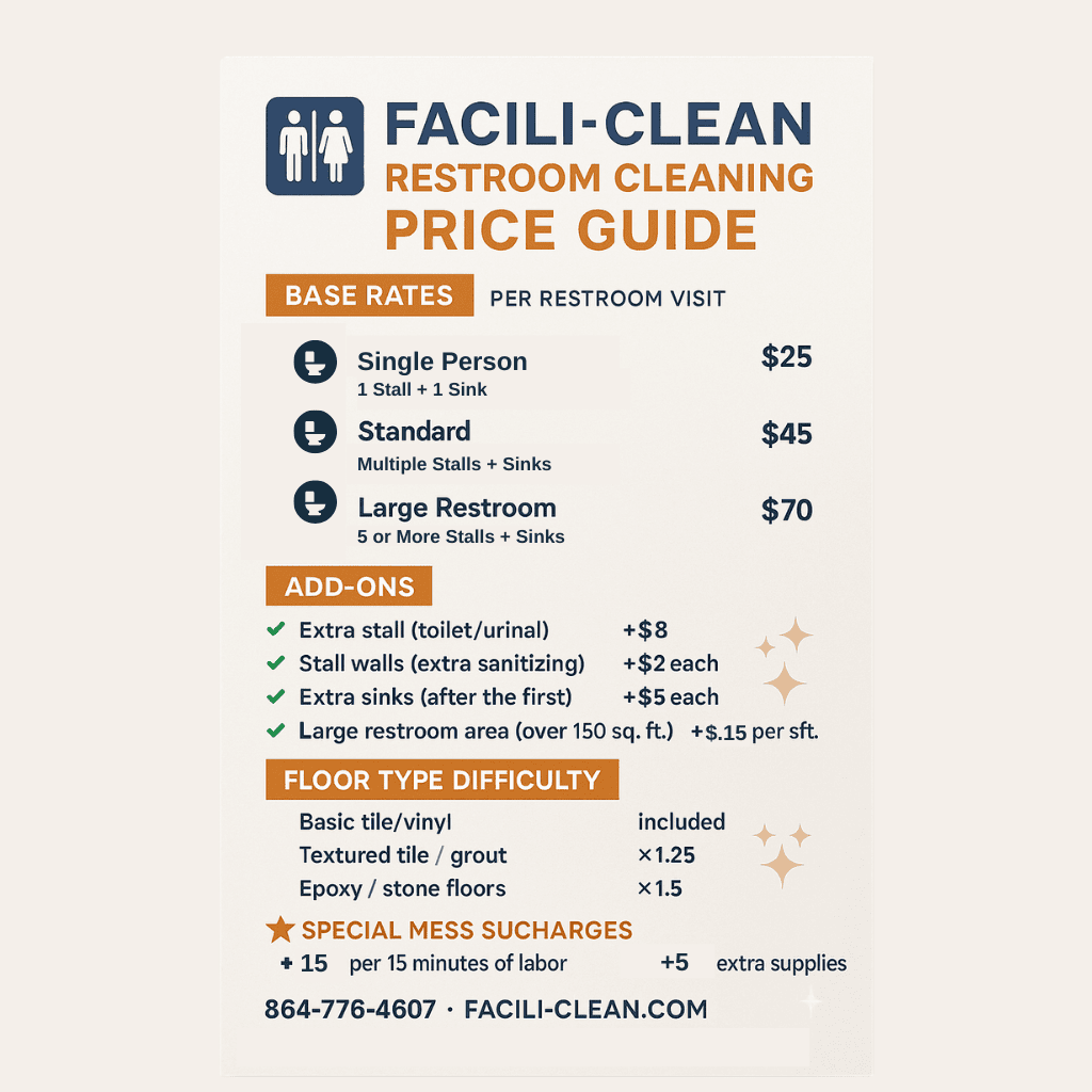Business are short staffed, and the next customer in line is your next priority. Don't let "toilet duty" go to the wayside. Your customers expect a clean bathroom, and your employees deserve a break. (Come on!- Was it that clean anyway?) Book with the pros and be confident that your reputation is not smeared by a dirty bathroom.